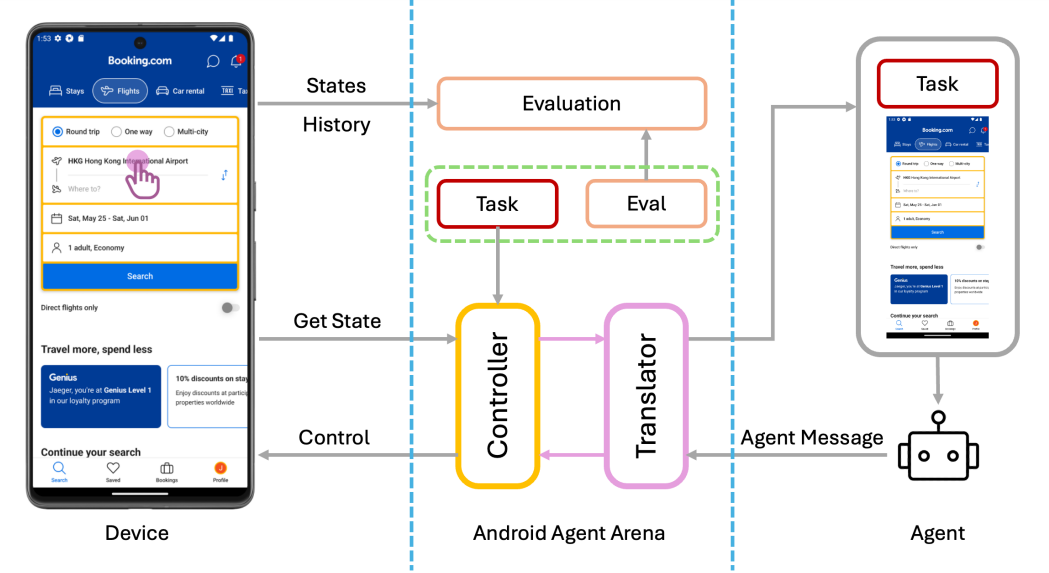 A3는 작업과 해당 evaluation functions을 통합합니다. 프로세스는 컨트롤러가 스크린샷과 XML(Extensible Markup Language) 파일을 포함하는 장치의 현재 상태를 검색하는 것으로 시작됩니다. 이 상태와 작업 지침은 이전 스크린샷, XML 파일, 작업과 같은 추가 정보와 함께 agent로 전송됩니다. agent는 입력을 분석하고 현재 상태를 기반으로 수행할 다음 작업을 예측합니다. 예측된 작업은 번역기로 전달되어 장치 제어 명령으로 변환되어 장치와 상호 작용합니다. 이 루프는 agent가 작업 완료를 알리거나 미리 정의된 최대 단계 수에 도달할 때까지 계속됩니다. 프로세스가 끝나면 evaluator는 evaluation function을 사용하여 작업이 성공적으로 완료되었는지 여부를 결정합니다. 이 시스템은 유연성과 확장성을 갖도록 설계되어 사용자가 새로운 앱과 작업을 쉽게 추가할 수 있으며 모든 agent를 위한 범용 번역기 시스템도 제공합니다.