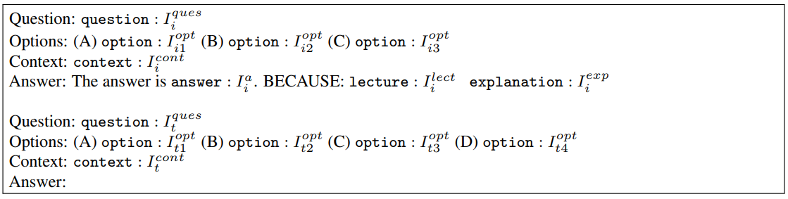 - Chain-of-thought (CoT) 생성을 통한 설명 가능성 확보: 모델이 정답을 예측하는 과정에서 lecture와 explanation 을 CoT 로 생성하도록 하여 모델의 reasoning 과정을 사람이 이해할 수 있도록 하였다.
