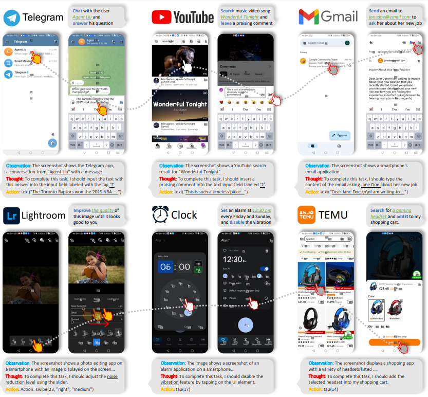 - 스마트폰 App 자동화: agent가 스마트폰 App을 인간처럼 조작하도록 하는, 흥미롭지만 도전적인 application에 초점.