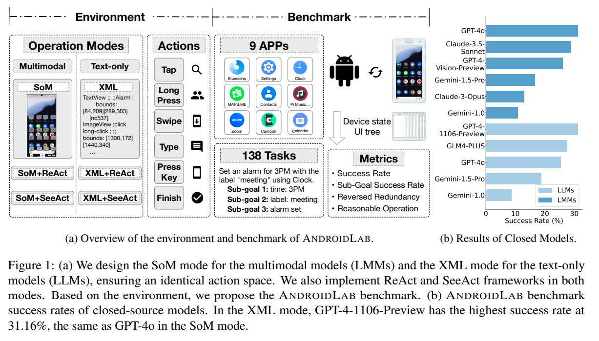 이러한 문제들이 새로운 Android agent evaluation 및 training framework를 개발하도록 동기를 부여했습니다. 이 논문에서 우리는 Android 장치와 상호 작용하는 agents를 위한 표준 운영 환경과 benchmark를 포함하는 ANDROIDLAB을 제안합니다. 우리는 모바일 시스템의 서로 다른 관찰 내에서 작업과 객체를 정렬하여 LLMs 및 LMMs 전반에 걸쳐 기본 작업 모드를 정의합니다. XML과 screenshots를 각각 XML 모드와 SoM 모드라고 합니다. 또한 각 기본 모드에 대해 ReAct와 SeeAct의 두 가지 모드를 도입합니다.