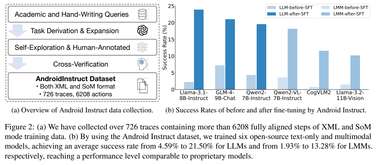 - Android Instruction 데이터셋을 이용한 fine-tuning을 통해 오픈소스 모델의 성능을 크게 향상시켰습니다 (LLMs의 평균 성공률 4.59%에서 21.50%로, LMMs의 평균 성공률 1.93%에서 13.28%로 향상).