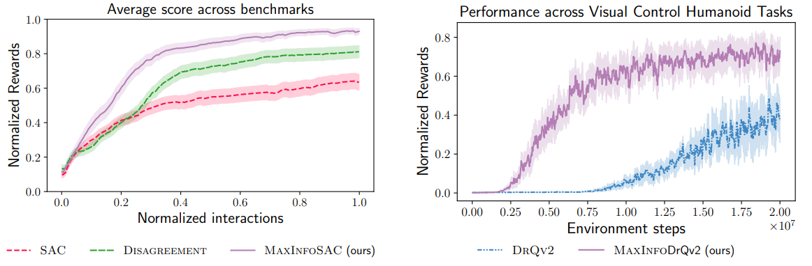 - Visual control task: DMC suite의 visual control task에서 MAXINFODRQ, MAXINFODRQV2가 DrQ, DrQv2 대비 우수한 성능 및 sample efficiency를 보였습니다. 특히, challenging visual control task인 humanoid task에서 MAXINFODRQV2는 model-free RL algorithm 중 가장 높은 성능을 기록했습니다.