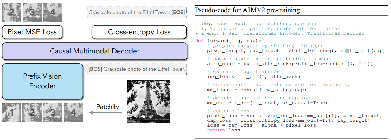 (오른쪽) AIMV2 사전 훈련 중 순방향 패스에 대한 의사 코드입니다. AIMV2의 사전 훈련 프로세스는 간단한 자기 회귀 목표에만 의존하기 때문에 AIM 및 LLM의 사전 훈련 프로세스와 유사하게 구현하기 간단합니다.