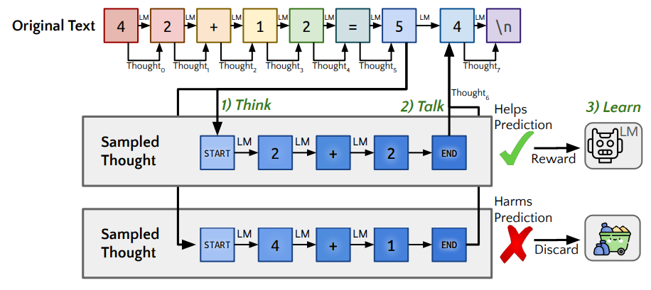 - Learn: REINFORCE 기반 reward를 사용하여 future text 예측에 도움이 되는 rationale 생성을 강화 (좋은 thought는 유지, 그렇지 않은 thought는 버림).