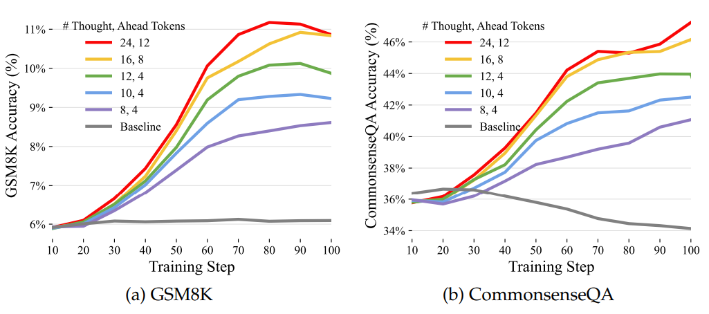Figure 2: Generalization Results. 우리는 Quiet-STaR로 trained된 모델이 reasoning이 필요한 문제를 직접적으로 answering하는 데 얼마나 generalize되는지 평가합니다. 왼쪽 plot (a)는 fine-tuning 없이 GSM8K에 대한 zero-shot accuracy를 보여주고, 오른쪽 plot (b)는 CommonsenseQA에 대한 zero-shot accuracy를 보여줍니다. 두 plot 모두에서, x-axis는 training steps를 나타내고, 각 line은 Quiet-STaR training 동안 사용된 thinking tokens의 다른 수를 나타냅니다. y-axis는 각각의 datasets에 대한 zero-shot direct accuracy를 측정합니다. 우리는 또한 Figure 6에 이 plot의 inference normalized version을 포함합니다.