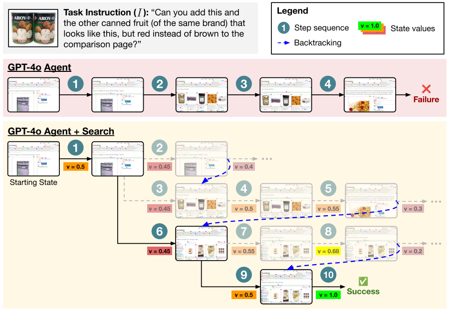 인지하고, 계획하고, 자율적으로 행동할 수 있는 agents를 구축하는 것은 artificial intelligence 연구의 오랜 목표였습니다. 최근 몇 년 동안 강력한 일반 기능을 갖춘 large language models (LMs)의 출현은 컴퓨터 작업을 자동화할 수 있는 language-guided agents를 구축하는 길을 열었습니다. 그러나 오늘날 최고의 LM agents는 여전히 인간보다 훨씬 성능이 떨어집니다. 현실적인 웹 벤치마크인 WebArena와 VisualWebArena에서 인간은 각각 78%와 89%의 작업에서 성공하지만, 최신 프론티어 models에 의해 구동되는 agents조차도 훨씬 성능이 떨어져 일반적으로 20% 미만의 성공률을 달성합니다. 기존 agents의 중요한 병목 현상 중 하나는 탐색 및 다단계 planning을 위해 테스트 시간 계산을 활용할 수 없다는 것입니다. search 및 planning은 개방형 웹 환경에서 특히 중요한데, 잠재적인 action space(즉, 웹 페이지에서 수행할 수 있는 모든 가능한 작업)가 대부분의 비디오 게임이나 텍스트 기반 시뮬레이터보다 훨씬 크기 때문입니다. 목표에 도달하기 위해 순서대로 수행해야 하는 그럴듯한 작업이 여러 개 있는 경우가 많으며, 궤적을 효율적으로 탐색하고 가지치기할 수 있는 능력이 필수적입니다.