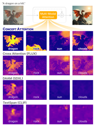 CONCEPTATTENTION은 각각 visual concepts (예: "dragon", "sun")에 해당하는 풍부하고 문맥화된 text embeddings 집합을 생성하여 작동한다. 이러한 concept embeddings와 image를 linearly projecting함으로써, 일반적으로 사용되는 cross attention maps보다 훨씬 더 높은 quality의 풍부한 saliency maps을 생성할 수 있다.