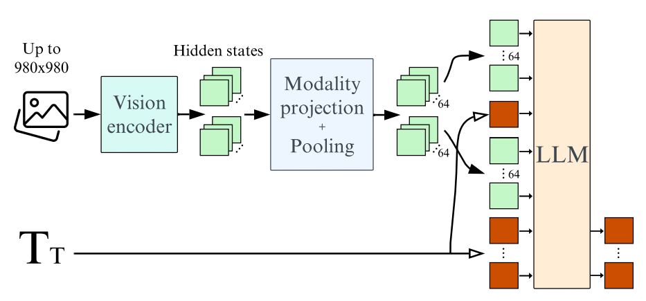 최근 VLM은 일반적으로 비전 인코더의 히든 상태 전체 시퀀스를 풀링 없이 모달리티 투영 레이어로 직접 전달하여 언어 모델에 입력