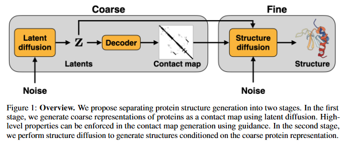 우리는 sampled된 contact maps에 generation 과정을 conditioning함으로써 SDMs를 개선할 수 있다고 가정합니다. contact map은 각 residues 쌍이 서로 짧은 distance 내에 있는지 여부를 나타내는 2D binary matrix로 정의됩니다. contact map은 단백질의 fold topology를 설명하기에 충분하며, coordinates는 biomolecular conformations를 포착하고 단백질의 function을 설명할 수 있습니다. 이전 연구들은 generative models이 의미 있는 representations을 학습하는 데 실패하며 alignment 또는 high-level conditioning으로부터 이점을 얻을 수 있음을 보여주었습니다. 우리는 후자의 직관에 따라 contact maps를 generate하기 위해 latent diffusion models (LDMs)를 사용하고, 이어서 contact map에 conditioned된 atomic coordinates를 generate하기 위해 SDMs를 사용하는 것을 제안합니다. 우리의 방법인 LSD (Latent and Structure Diffusion)는 large datasets에 대한 training을 가능하게 하고, 그 다음 원하는 properties를 위해 guiding할 수 있도록 합니다.