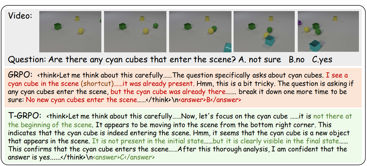 - Temporal 정보 활용을 장려하는 새로운 RL algorithm T-GRPO 제안.