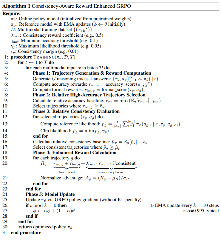 - KL Penalty 대체: 기존 GRPO의 KL divergence penalty를 제거하고, adaptive하고 group-relative한 consistency bonus로 대체하여 더 효과적인 exploration을 유도.
