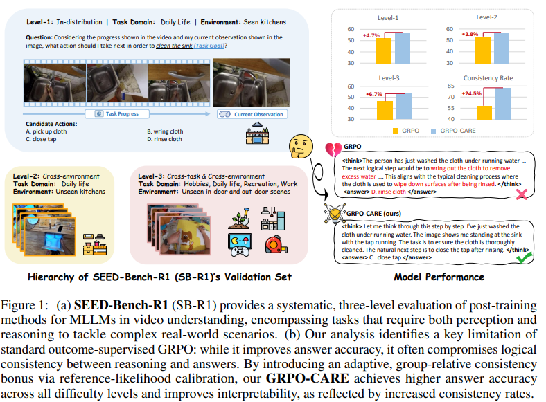 KL penalty를 adaptive, group-relative consistency bonus로 대체함으로써, GRPO-CARE는 SEED-Bench-R1에서 표준 GRPO를 일관되게 능가하여, 가장 어려운 evaluation level에서 6.7%의 performance gain과 consistency rate에서 24.5%의 개선을 달성했습니다. 더욱이, GRPO-CARE는 강력한 transferability를 보여주며 다양한 video understanding benchmarks에서 model performance를 향상시킵니다. 우리의 연구는 체계적으로 설계된 benchmark와 일반화 가능한 post-training framework를 제공하여, 더 interpretable하고 robust한 MLLMs의 발전에 기여합니다.