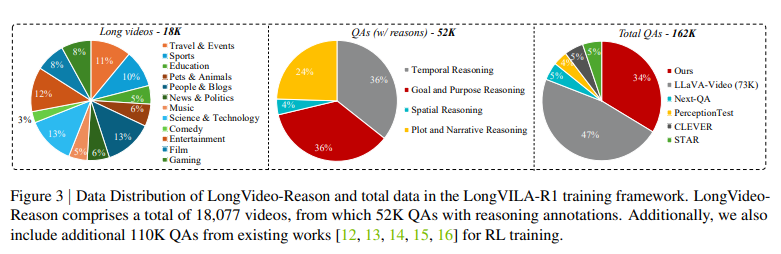 이 이미지는 LongVILA-R1 training framework에 사용된 LongVideo-Reason dataset과 전체 데이터의 분포를 보여줍니다. 왼쪽 첫 번째 파이 차트는 18,000개 긴 동영상의 장르별 분포를 나타냅니다. 가운데 차트는 reasoning이 포함된 52,000개 QA의 유형(Temporal, Goal and Purpose, Spatial, Plot and Narrative Reasoning)별 분포를 보여줍니다. 오른쪽 차트는 LongVILA-R1 학습에 사용된 전체 162,000개의 QA 데이터가 다른 기존 dataset들과 비교하여 어느 정도의 비율을 차지하는지 보여줍니다