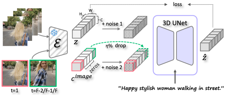 여기서 PADs ∈ R^((F −2)×C×H×W)입니다. 그런 다음 condition c_image는 channel dimension을 따라 noised latent z_t와 연결되며, 이는 diffusion model의 입력으로 사용됩니다.