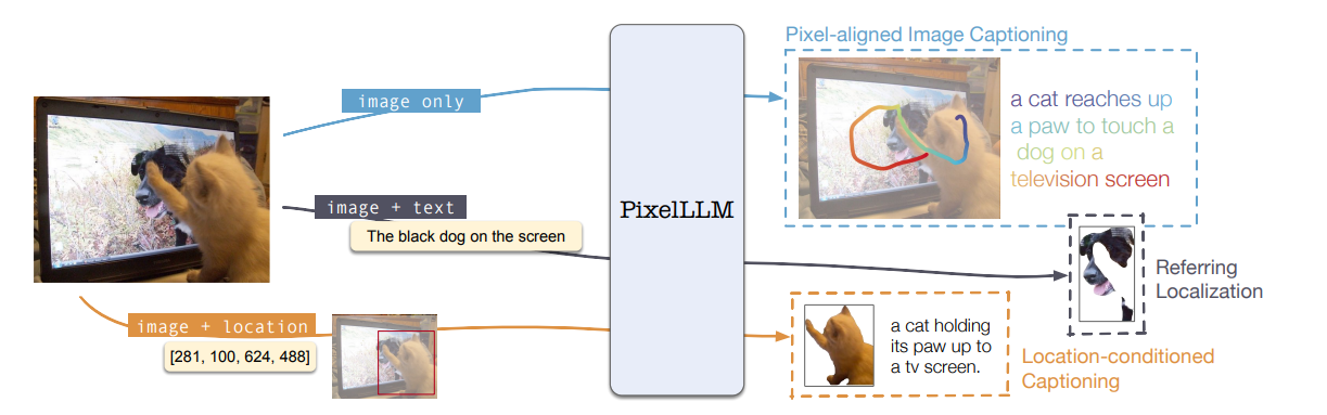 - 우리는 입력 이미지에 대한 caption과 각 단어의 localization을 함께 출력하는 vision-language model인 PixelLLM을 소개합니다. PixelLLM은 이미지를 입력으로 받고, 선택적으로 location prompt 또는 text prompt를 받습니다.