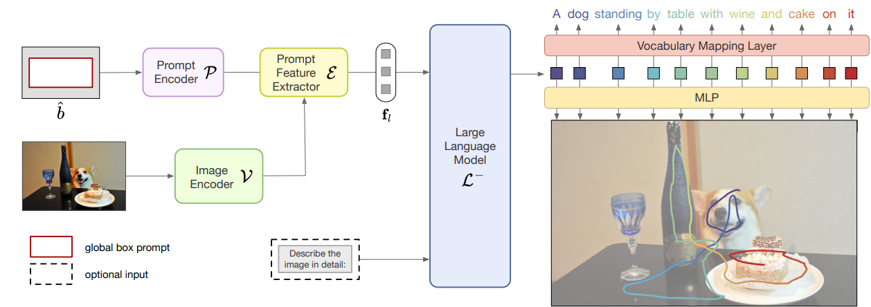 이러한 prompt-conditioned image features와 선택적인 text prompt는 large-language model의 prefix로 직접 입력되며, 이 모델은 captioning과 per-word localization 출력을 생성합니다. 우리는 이 architecture가 일반적이며 language 또는 location을 입력 또는 출력으로 사용하는 다양한 vision-language tasks에 적응할 수 있음을 보여줍니다.