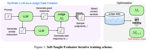 우리는 이러한 평가자를 훈련시키기 위한 새로운 방법을 제안합니다. 우리의 전체적인 방법은 현재 모델의 판단을 구성된 합성 데이터를 사용하여 주석을 달아 개선 사항을 부트스트랩하는 반복적인 훈련 체계입니다. 따라서 Self-Taught Evaluator는 다음 반복에서 더 나은 성능을 발휘합니다. 전체 파이프라인은 다음과 같습니다: