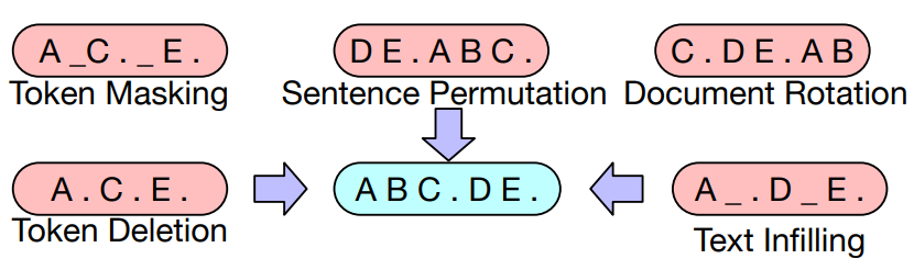 - Token masking, token deletion, text infilling, sentence permutation, document rotation 등.