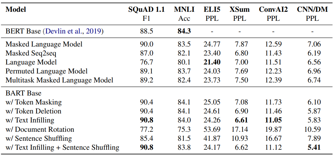 - Ablation study: 다양한 pretraining scheme을 BART framework 내에서 복제하여 end-task 성능에 영향을 미치는 요인 분석.