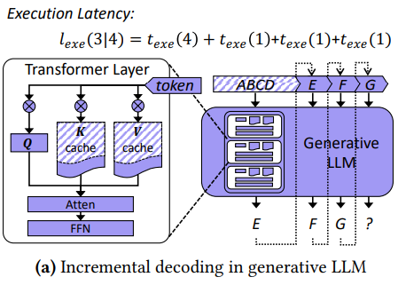 그런 다음 각 incremental decoding iteration은 현재 생성된 token과 함께 모든 input을 고려하고 하나의 output token을 생성합니다. 그림 1a는 generative LLM이 "ABCD"를 input sequence (즉, 𝑆𝑖𝑛 = 4)로 사용하고 각 iteration에서 하나의 output token을 생성하는 예를 보여줍니다.