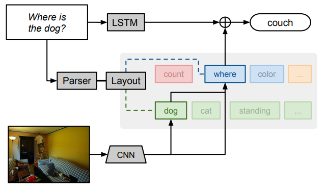 이 접근 방식은 질문을 언어적 하위 구조로 분해하고 이러한 구조를 사용하여 모듈식 네트워크(개 인식, 색상 분류 등을 위한 재사용 가능한 구성 요소 포함)를 동적으로 인스턴스화합니다. 결과적으로 생성된 복합 네트워크는 jointly trained됩니다.