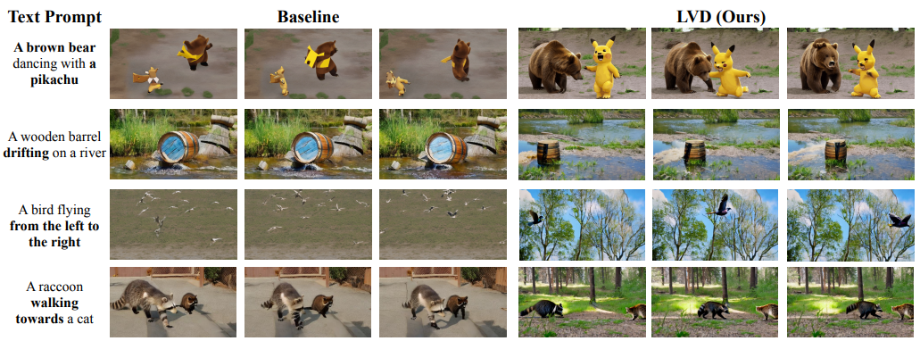 오른쪽: 동일한 모델에 적용했을 때, training-free 방법인 LVD는 입력 텍스트 프롬프트에 closely align되는 사실적인 비디오를 생성할 수 있습니다.