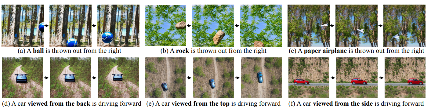 그림 4의 DSL에서 우리의 방법 LVD로 생성된 비디오. 우리의 접근 방식은 입력 텍스트 프롬프트에 올바르게 맞춰지는 비디오를 생성합니다. (a-c)는 오른쪽에서 왼쪽으로 던져지는 다양한 객체를 보여줍니다. (d-f)는 서로 다른 시점에서 본 동일한 유형의 객체를 묘사합니다.