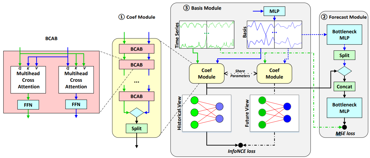 - BCAB (Bidirectional Cross-Attention Block) 을 통해 시계열과 기저 벡터 간의 관계를 학습합니다.