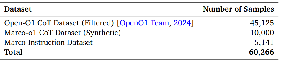 - Marco-o1 CoT Dataset (Synthetic): MCTS를 사용하여 Marco-o1 CoT 데이터 세트를 생성하여 복잡한 추론 경로를 공식화하고 모델의 추론 능력을 강화합니다.