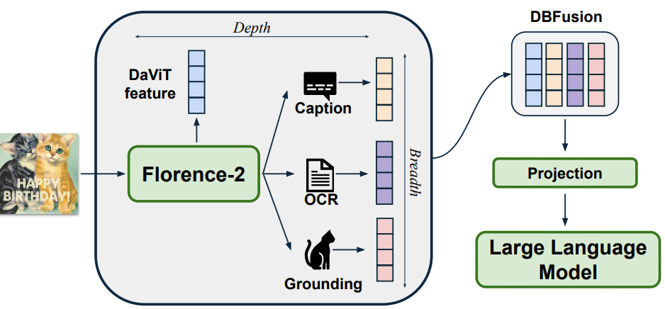 - Florence-VL은 Florence-2와 large language model로 구성됩니다.