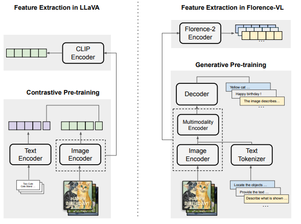 그림 1. LLaVA 스타일 MLLM과 Florence-VL 비교. LLaVA 스타일 모델은 contrastive learning으로 pretrained된 CLIP을 사용하여 단일 high-level image feature를 생성합니다. 반면, Florence-VL은 이미지 캡셔닝, OCR 및 grounding과 같은 다양한 vision task에서 generative modeling으로 pretrained된 Florence-2를 활용합니다. 이를 통해 Florence-VL은 Florence-2를 image encoder로 사용하여 여러 task-specific image features를 유연하게 추출할 수 있습니다.