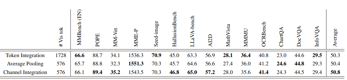 - LLaVA-1.5 데이터 세트를 사용하여 실험한 결과, Channel Integration이 가장 좋은 성능과 학습 효율성을 보였습니다. 따라서 채널 통합 방식을 채택합니다.