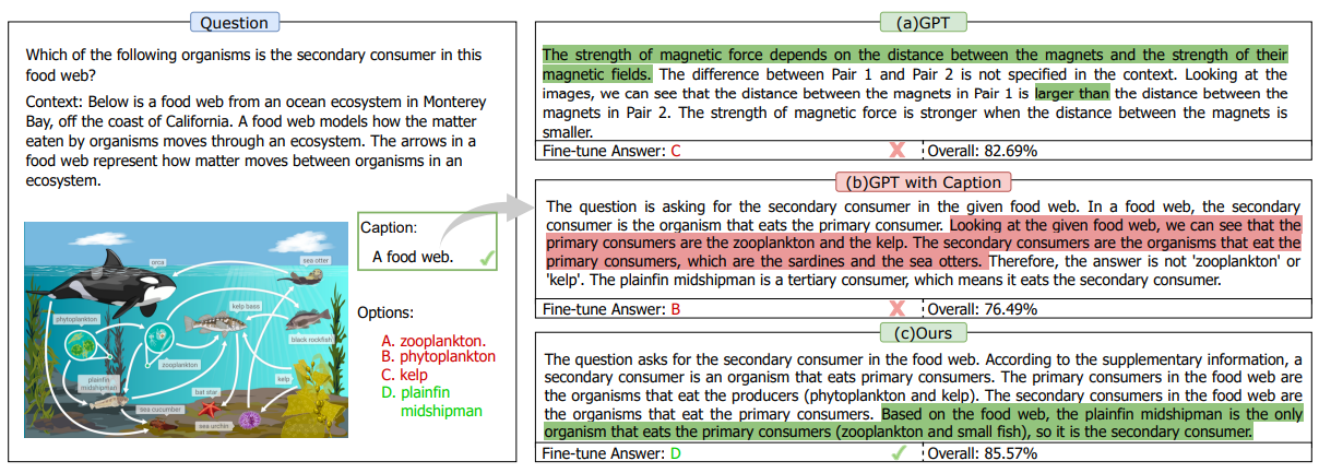 Interleaved 정보는 hallucination을 악화시킵니다. 이미지 정보를 포함하는 multimodal 논리적 근거를 생성하기 위한 과제는 한 번에 interleaved multimodal 정보를 제공함으로써 악화되는 language hallucination을 완화하는 데 있습니다. 순진한 시도는 이미지 캡션을 추출하여 질문과 결합하여 공동 prompt로 사용하는 것입니다. 이미지 정보의 통합에도 불구하고, 생성된 논리적 근거는 초기 기대와 일치하지 않는 이미지 관련 질문에 대해 차선책으로 남아 있습니다. 다양한 사례를 분석한 결과, interleaved 정보는 LLM을 hallucination으로 유도하여 조작된 시각 정보를 생성하는 경향이 있음을 관찰합니다. 그림 4에서 설명된 것처럼, 우리는 필요한 정보가 부족한 이미지에서 "먹이 그물"이라는 캡션을 추출했습니다. 결과적으로, 언어 모델은 "1차 소비자는 동물성 플랑크톤과 다시마이다"와 같은 이미지 관련 정보를 상상하게 되어 (그림 4(b) 참조) 신뢰할 수 있는 지식과 language hallucination을 구별하는 데 어려움을 겪습니다.