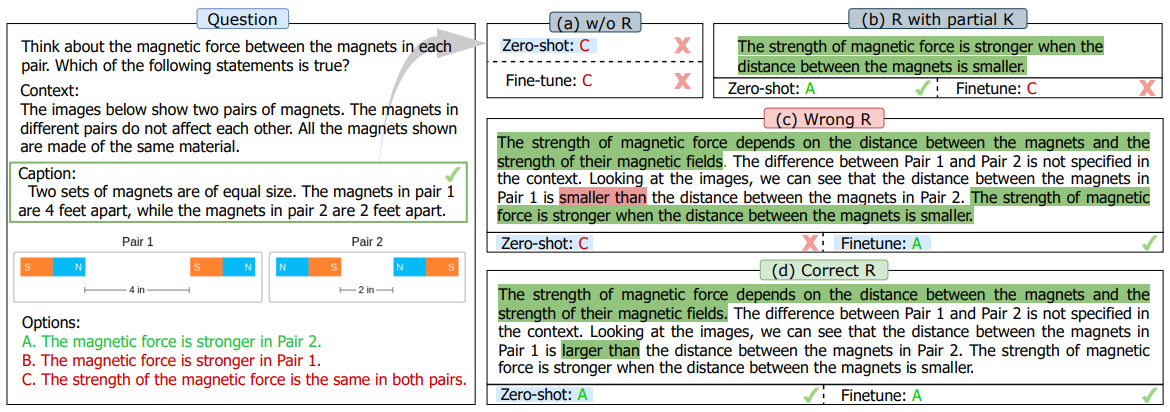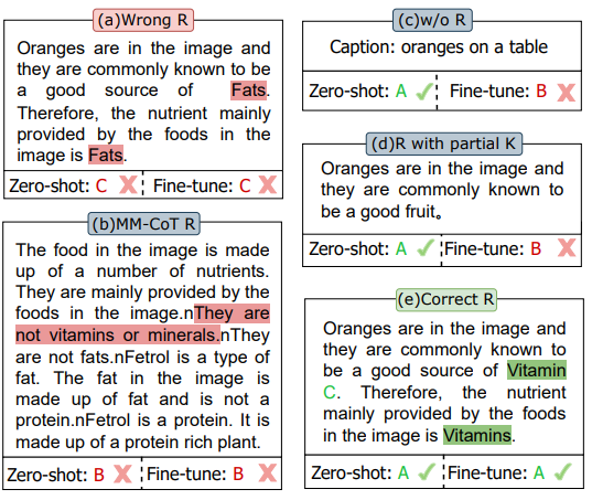 그림 2: multimodal 추론에서 입력 논리적 근거의 중요성과 zero-shot 및 fine-tuning 시나리오에서 논리적 근거의 상이한 역할을 보여주는 예시.