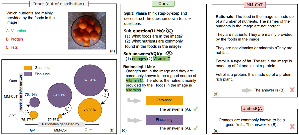 그림 1: 기존의 multimodal CoT 방법과 우리의 DDCoT 비교. (a), (c), (d) 및 (e)는 일반화 가능성을 설명하기 위한 분포 외(out-of-distribution) 예시이며, (b)는 zero-shot 및 fine-tuning 학습의 성능을 나타내며, 우리가 최초로 일반적인 multimodal 논리적 근거를 생성함을 보여줍니다.