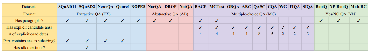 그림 2: 본 연구에 포함된 다양한 QA datasets의 속성: 5개의 extractive (EX), 3개의 abstractive (AB), 9개의 multiple-choice (MC), 3개의 yes/no (YN). 'idk'는 'I don't know' 또는 답변할 수 없는 질문을 나타냅니다. BoolQ는 원본 dataset과 contrast-sets 확장인 BoolQ-CS를 모두 나타냅니다. ROPES, Quoref 및 DROP의 경우도 마찬가지입니다.