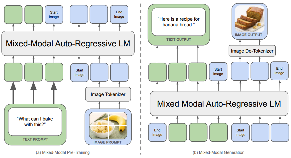 - Mixed-Modal Foundation Model: 이미지와 텍스트를 임의의 순서로 섞어서(interleaved) 처리하고 생성할 수 있습니다. 즉, 이미지와 텍스트가 섞인 문서를 이해하고, 그러한 문서를 생성해 낼 수 있습니다.