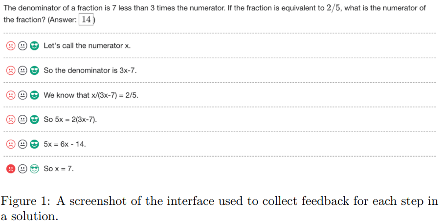 그들의 임무는 그림 1과 같이 solution의 각 단계에 positive, negative 또는 neutral label을 할당하는 것입니다. positive label은 단계가 정확하고 합리적임을 나타냅니다. negative label은 단계가 부정확하거나 불합리함을 나타냅니다. neutral label은 모호함을 나타냅니다. 실제로, 단계가 미묘하게 오해의 소지가 있거나 기술적으로 여전히 유효하지만 좋지 않은 제안인 경우 중립으로 labeling 될 수 있습니다. 우리는 중립 label을 허용하는데, 이는 모호성을 처리하는 방법에 대한 결정을 연기할 수 있기 때문입니다. 테스트 시 중립 label을 positive 또는 negative로 처리할 수 있습니다. labeling 지침에 대한 더 자세한 설명은 부록 D에 제공됩니다.